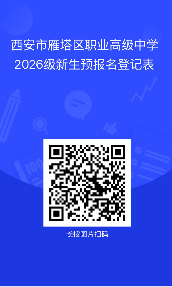 桃李春风等你来——西安市雁塔区职业高级中学启动2026级新生报名在线登记工作发表时间:2026-03-16 16:27 学校简介—— 西安市雁塔区职业高级中学是雁塔区政府主办、区教育局主管的全日制公办中等职业学校。学校始建于1958年,1984年转制为职业学校,2003年被评为市级重点职业学校和艺术示范学校,2007年成立区职业教育中心,2010年获市级“文明校园”称号,2013年设立区社区教育学院。2023年,学校成为全国数字创意行业产教融合共同体常务理事单位、陕西财经职教集团常务理事单位,并加入西安市国际陆港物流产教联盟及市域产教联合体,同时与西安市航天中学建立“名校+”合作关系。 学校秉持“创社会满意学校、育时代有用之才”的办学目标,紧抓职业教育改革机遇,深化办学模式,提升教育质量。积极推进“1+X”证书试点工作,帮助学生考取职业技能等级证书。聚焦学生升学和就业,构建现代职业教育与终身教育体系,拓宽学生成长路径,培养了大批具备专业技能和实践能力的中等技术人才。 学校位于西安市雁塔区沈家桥一路,占地25.7亩,拥有21个实训室,教学、实训、办公、生活设施齐全。师资力量雄厚,现有教职工108人,其中省、市、区骨干教师15人,“双师型”教师20人。思政教师5人、体育教师7人、美育教师12人、专职校医1人、心理健康教师1人,形成了一支名师引领、骨干支撑、梯队合理的教师队伍。 学校开设幼儿保育、会计事务、电子电器应用与维修、播音与主持、工艺美术5个专业,其中会计事务专业为市级教研中心组组长学校。现有教学班24个,在校生1052人。 学校深化产教融合、校企合作,西安亮丽仪器仪表有限公司、陕西青檬教育科技有限公司、曲江第十三幼儿园、雁塔区第十四幼儿园、新道科技股份有限公司、杭州朗讯科技有限公司、湖南金职伟业有限公司、完美世界教育有限公司等单位合作建立了实习就业基地,多名毕业生成长为企、事业骨干。 学校推进“三教”改革和“名校+”工程,与西安航天中学开展普职融通合作。学生通过各类高考升入陕西师范大学、西北大学、西安建筑科技大学、西安石油大学、西安工程大学、西安外国语大学、西安理工大学、塔里木大学、延安大学、井冈山大学、西安美术学院、西安音乐学院、西安工业大学、榆林大学 、宝鸡文理学院、西安文理学院、安康学院、渭南师范学院、咸阳师范学院、陕西工业职业技术大学、陕西农林职业技术大学、陕西铁路工程职业技术学院等高校。与西安职业技术学院共建培训基地,并与多所高职院校实现中高职贯通,彰显“升学有道、就业无忧”的办学特色。 西安市雁塔区职业高级中学以严谨校风、规范管理、先进设备、公办信誉、可靠质量、合理收费、优美环境,成为有志青年学习成长的理想选择。 在线扫码登记 编辑|王珩 审核|李刚